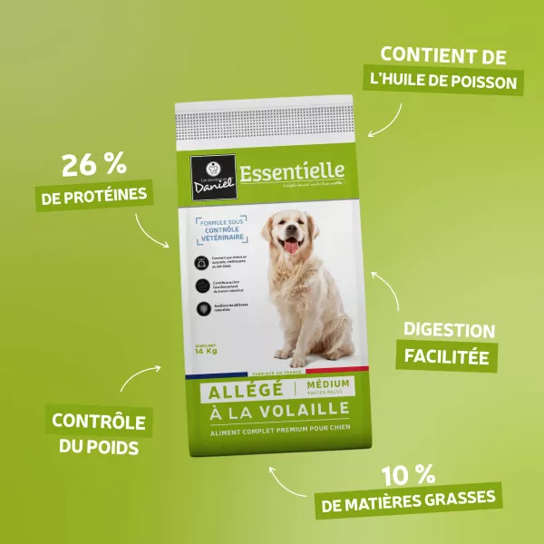La recette « Essentielle – Allégée » est une alimentation premium spécialement formulée pour les chiens âgés et/ou en surpoids. Sa forte teneur en protéine de volaille, en riz et en pois, limite les intolérances au gluten de votre chien.